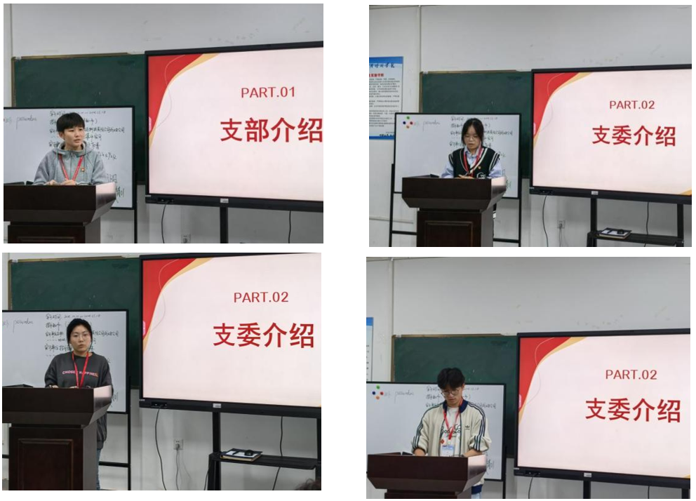 会议伊始,主持人介绍本次会议将分为支部介绍、支委介绍、业务培训三个部分开展。随后,商学院学生第二支部副书记乔思琪同志阐述了会议目的,概述了支部情况,并希望同学们认真学习培训内容,以便更好地了解支部工作的相关技巧。接着,支委会成员汪宁、王晓余、田振宇同志分别上台进行自我介绍并简单介绍组内工作。