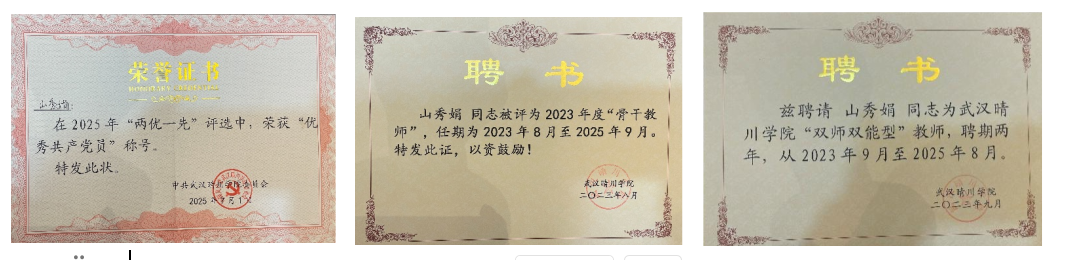 武汉晴川学院“双师双能型”教师,任期为2023年9月至2025年8月;