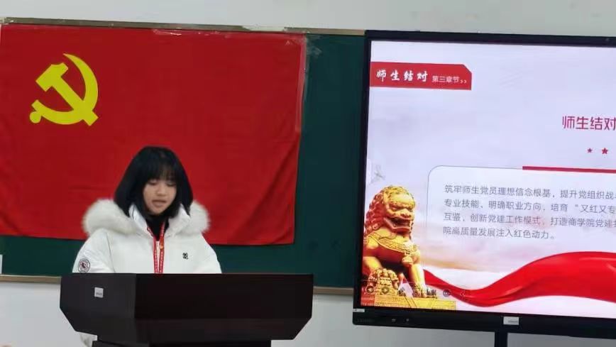 随后,主持人潘望娣正式宣布启动 “师生结对” 计划。该计划以党建引领、育人为本、产学融合为核心发展思路,通过组织联建、资源共享搭建师生互动平台;核心目标为筑牢师生理想信念根基,提升党组织凝聚力和战斗力,帮助学生明晰职业发展方向,培育又红又专的商科优秀人才;具体实施举措包含每学期开展1次联合理论学习与主题党日活动,建立师生党员结对帮扶长效机制,打造“党建+商科实践”特色品牌项目。她强调,希望通过该计划推动师生携手参与社会服务,实现党建工作与育人工作深度融合、互促共进。