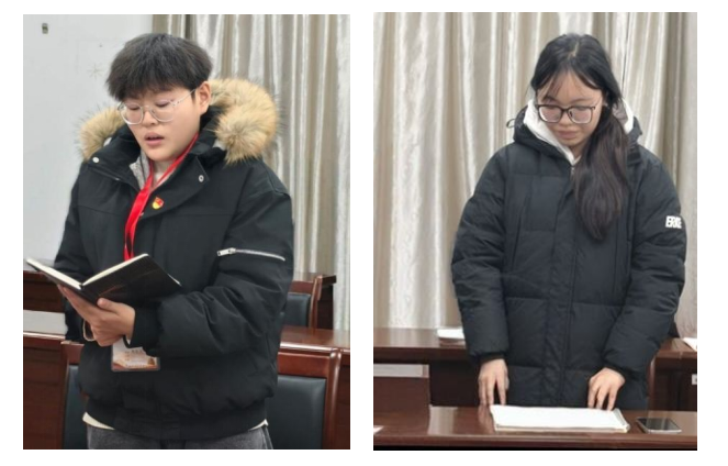 学习感悟分享环节,学生支部的两位代表高佳丽和陶雅焓先后分享学习体会。二人一致认为,作为青年学生,既要深耕学业、筑牢专业根基,保持优良成绩,更要锚定发展方向、尽早明晰成长目标;要始终坚守自律自觉,做到高效履职执行,切实发挥先锋模范带头作用,主动带动身边同学共同进步,着力锤炼过硬本领,全面提升自身综合素质。