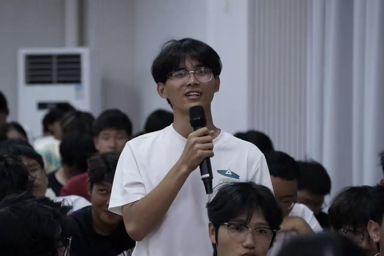 讲话结束,会议进入互动环节。新生们踊跃举手,针对物流管理专业课程设置,薛院长详细拆解“专业基础课(管理学、Python等)-核心课(现代物流管理、运输管理等)-选修课(三创实践、跨境电商创业)-集中实践”的课程体系,说明每类课程的学习目标;姚院长回应学科竞赛问题时也提出了相关建议,特别强调了“商科竞赛拼的是团队协作,要学会和不同专业的同学互补合作”;辅导员毛老师则明确入党的基础条件,并告知后续会开展专项讲座详细讲解入党流程。