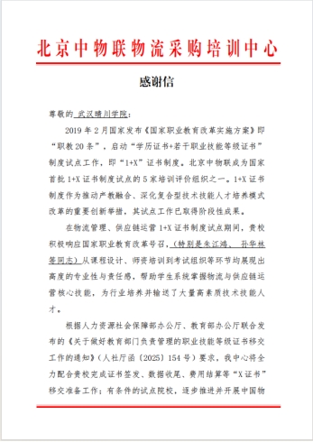 (通讯员:李蓓)近日,北京中物联物流采购培训中心向我校发来感谢信,对我校在“1+X”物流管理、供应链运营证书制度试点期间所做出的积极贡献与鼎力支持表示衷心感谢,并对后续证书移交与衔接工作提出合作展望。