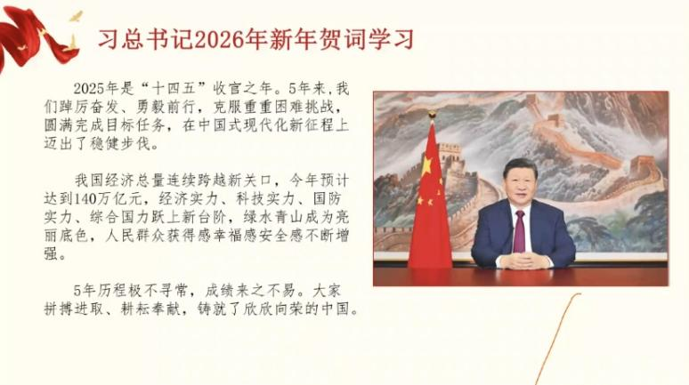 随后,王希怡组织全体成员观看2025年发展成就回顾主题视频。视频全面展现了国家在科技突破、文化繁荣、国防巩固等领域取得的丰硕成果,让大家直观感受到中国式现代化建设的坚实步伐。成员们纷纷表示,要以视频中的奋斗事迹为榜样,在“十五五”开局之年勇担使命、奋勇争先。
