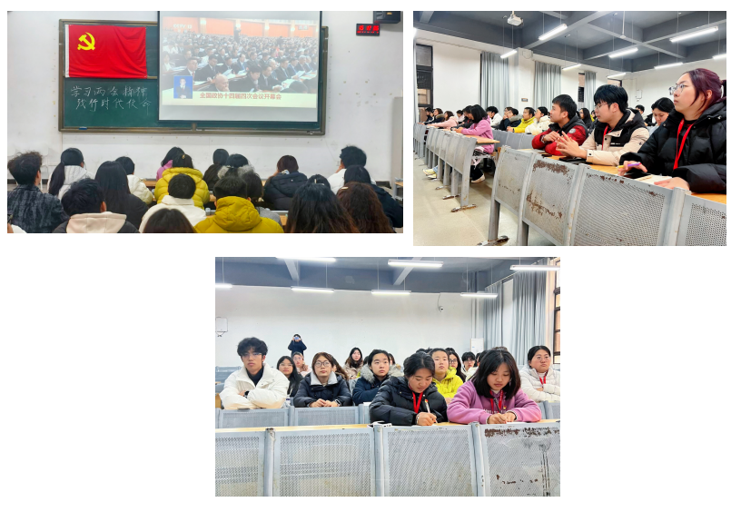 观看过程中,大家全神贯注、认真聆听、仔细记录,深入领会两会精神内核,内心深受鼓舞与感召。同时,成员们不仅对国家过去一年的发展成就和未来的发展蓝图有了更清晰、更深刻的认识,更厚植了家国情怀,增强了社会责任感与时代使命感,从“旁观者”变为强国建设、民族复兴的参与者和奋斗者。