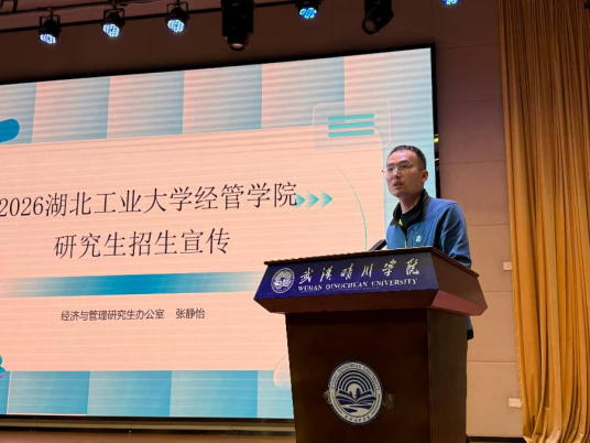 随后,2026届考研学生代表、金融科技2202班的向世灿学长登台分享备考经验。结合自身上岸经历,他从择校、备考、专业课准备及心态调整四大维度,为学弟学妹们提供了详实实用的建议。紧接着,湖北工业大学经管学院的两位老师先后带来宣讲,为学子们拓宽升学视野。王利军副教授全面解读了湖北工业大学的多元成长资源,刘洋副教授则聚焦金融专硕,详细介绍了学院的办学特色,为学子们提供了清晰的升学选择参考。